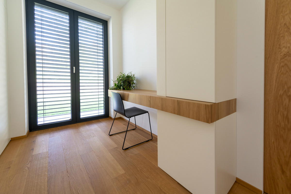 In the kitchen, the combination of dark ultrapas, white-painted MDF and lacquered oak veneer is enriched by the most modern fittings and hidden ways of opening doors and drawers. In the dining room there is a table made of solid oak wood. White and oak are the red thread of all other rooms.